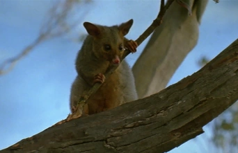 Possums were quadrupedal creatures that had a pointy snout, beady black eyes, small ears, a body round as a loaf of bread, and a furry tail, as long again as their body. Their four black legs ended in four clawed toes with a fifth unclawed but opposed, adapted to grasping tree limbs. They had scruffy, bristly fur, and their mouth contained forty-eight teeth.[1] Fin Raziel, a good sorceress from Tir Asleen, was turned into a grey possum by her rival, Bavmorda.[2]