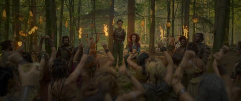 Willow tries to continue Elora’s magic training but she is still struggling. The group settles in. Boorman and Graydon talk about women, love, and passion. Boorman notices a skull on the ground and he starts to get suspicious. He sits down to the group and tells them no matter what happens next- he has a plan. Suddenly, the group is surrounded and ambushed by Bone Reavers, a group of soldiers who wear skull masks.